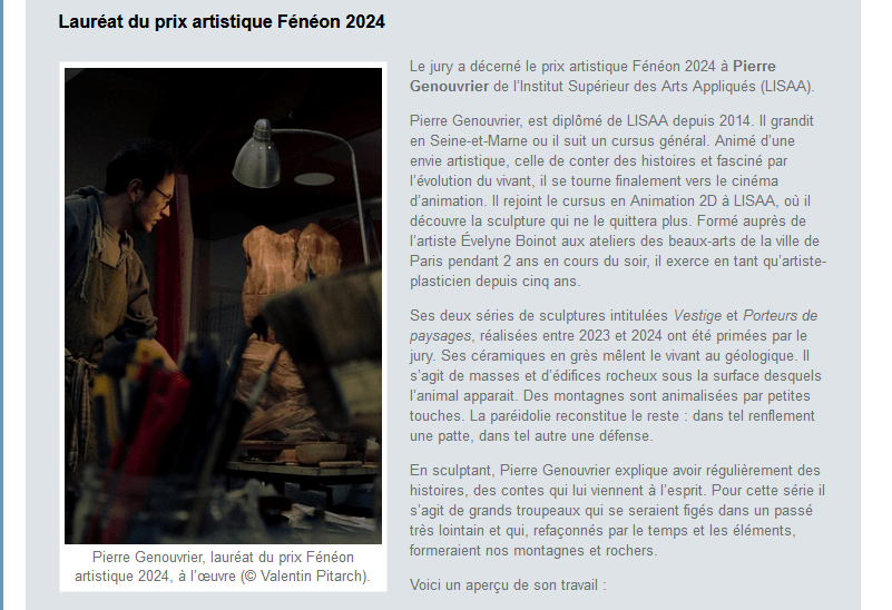 Annonce du prix artistique Fénéon sur le site de la Chancellerie des universités de Paris
