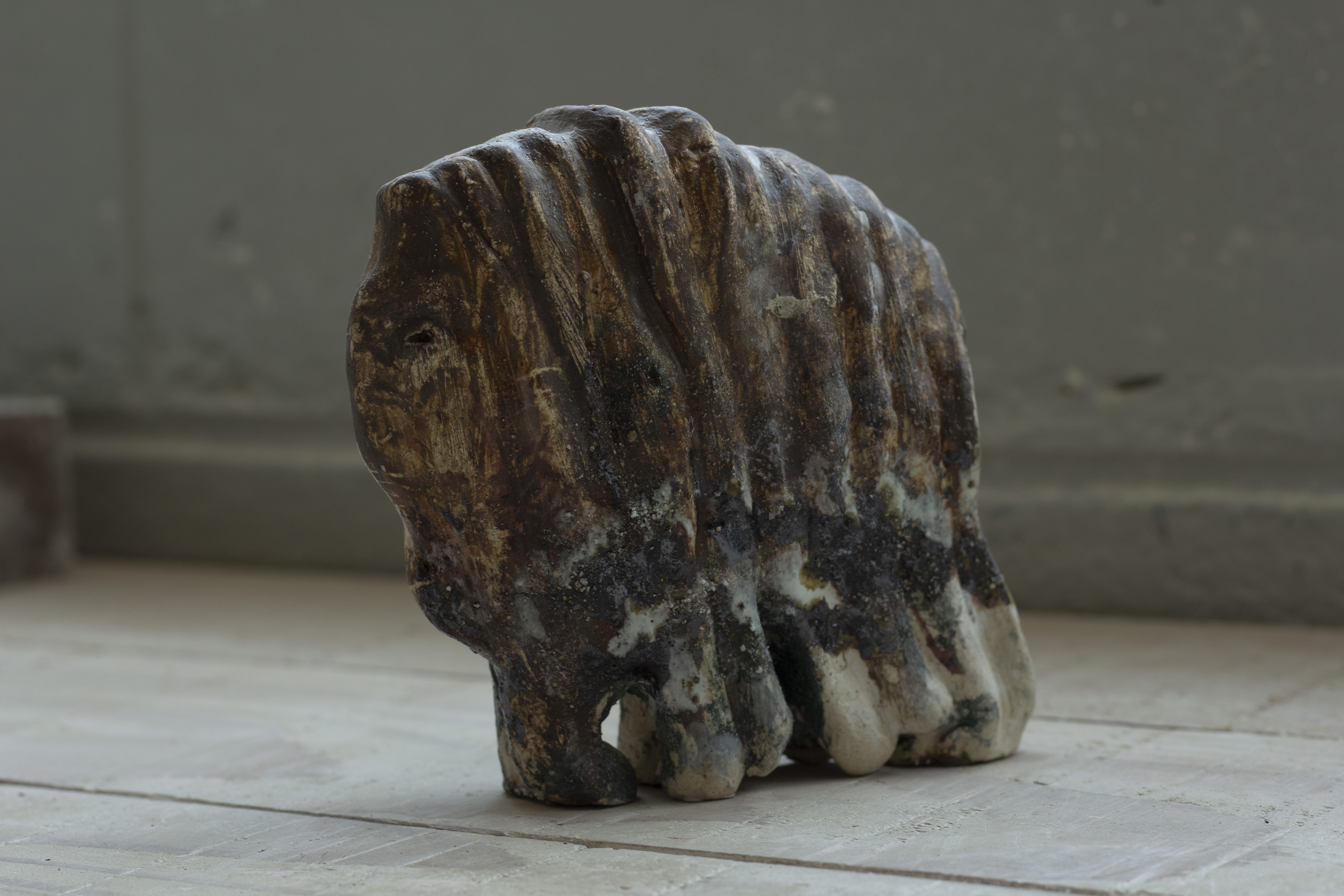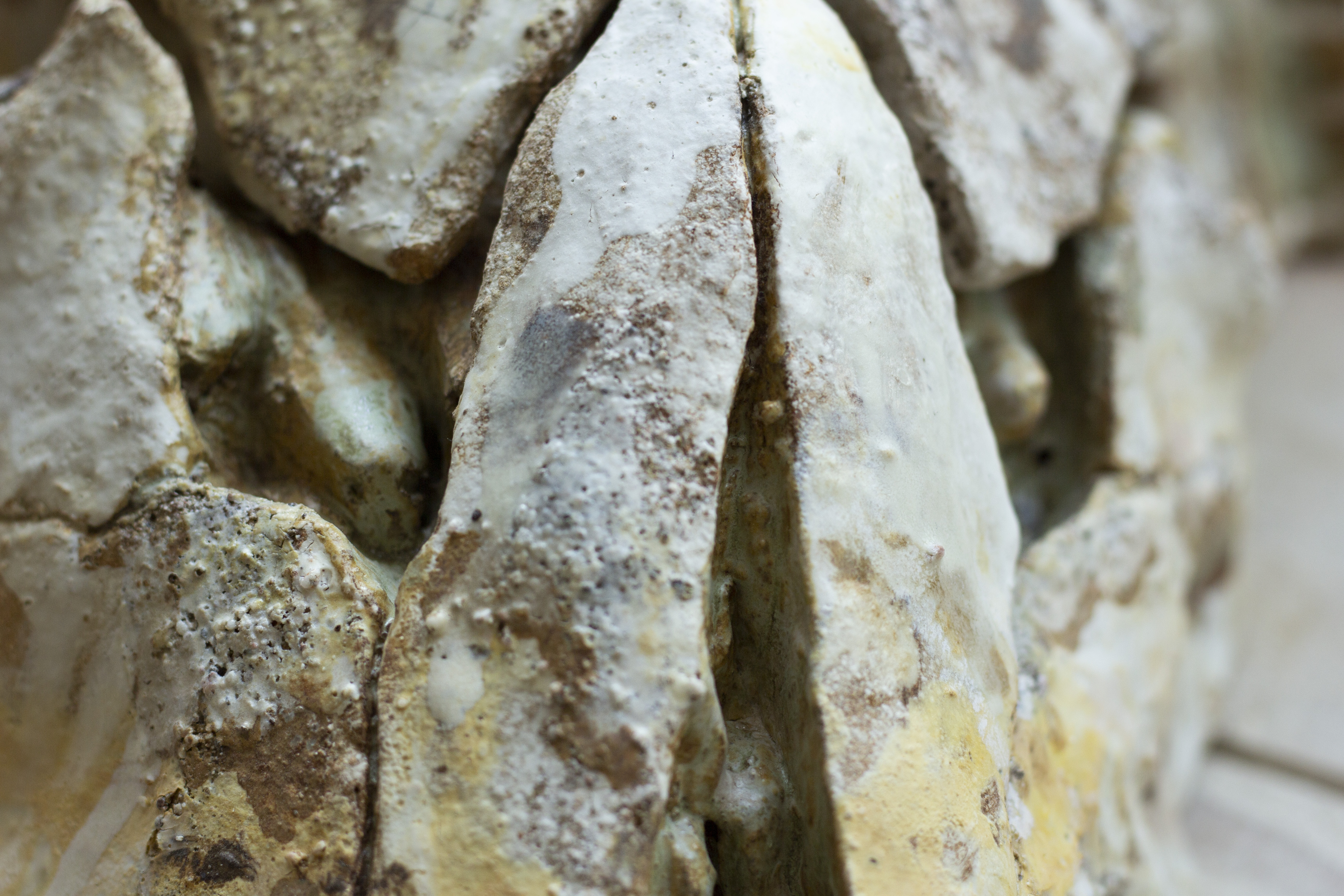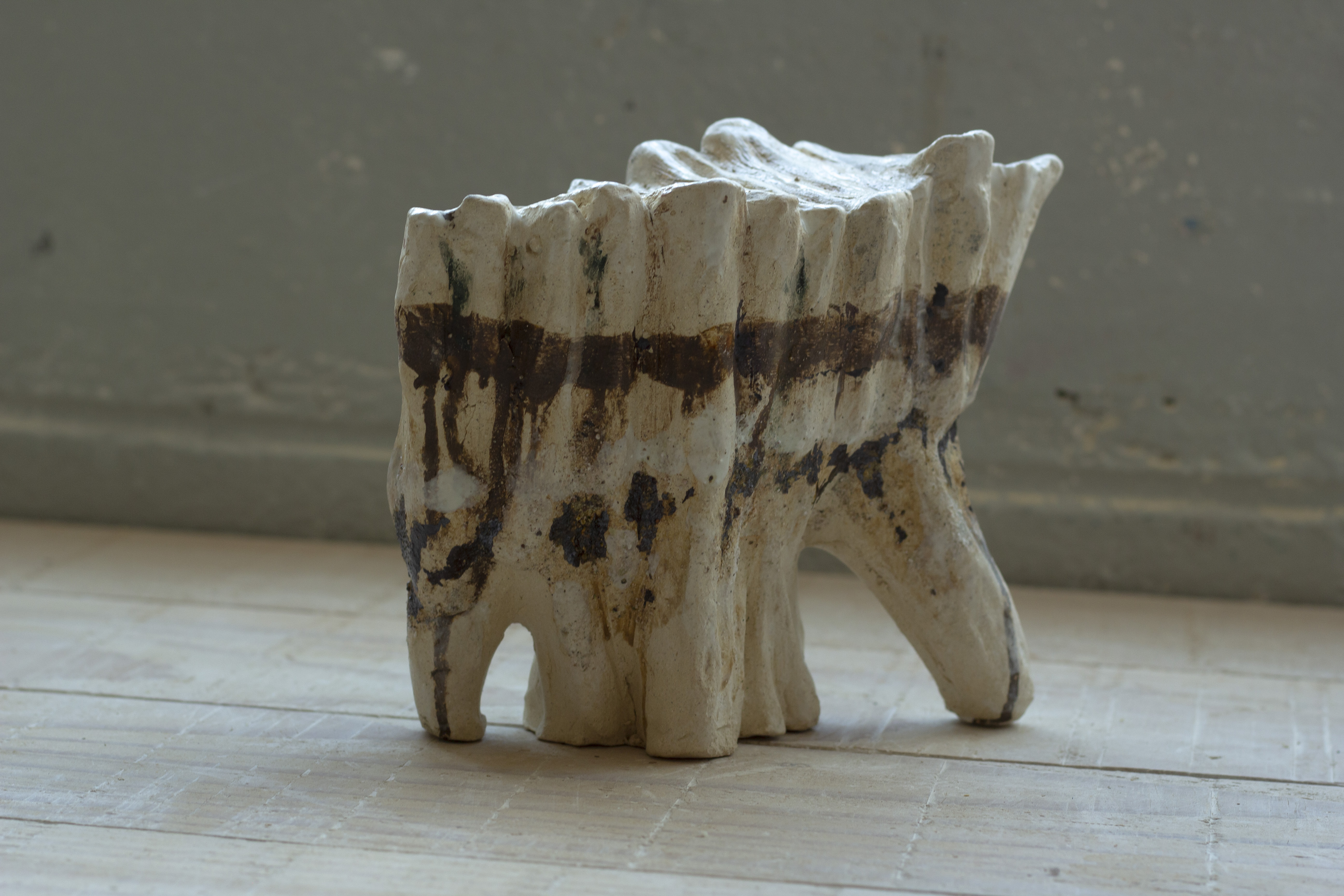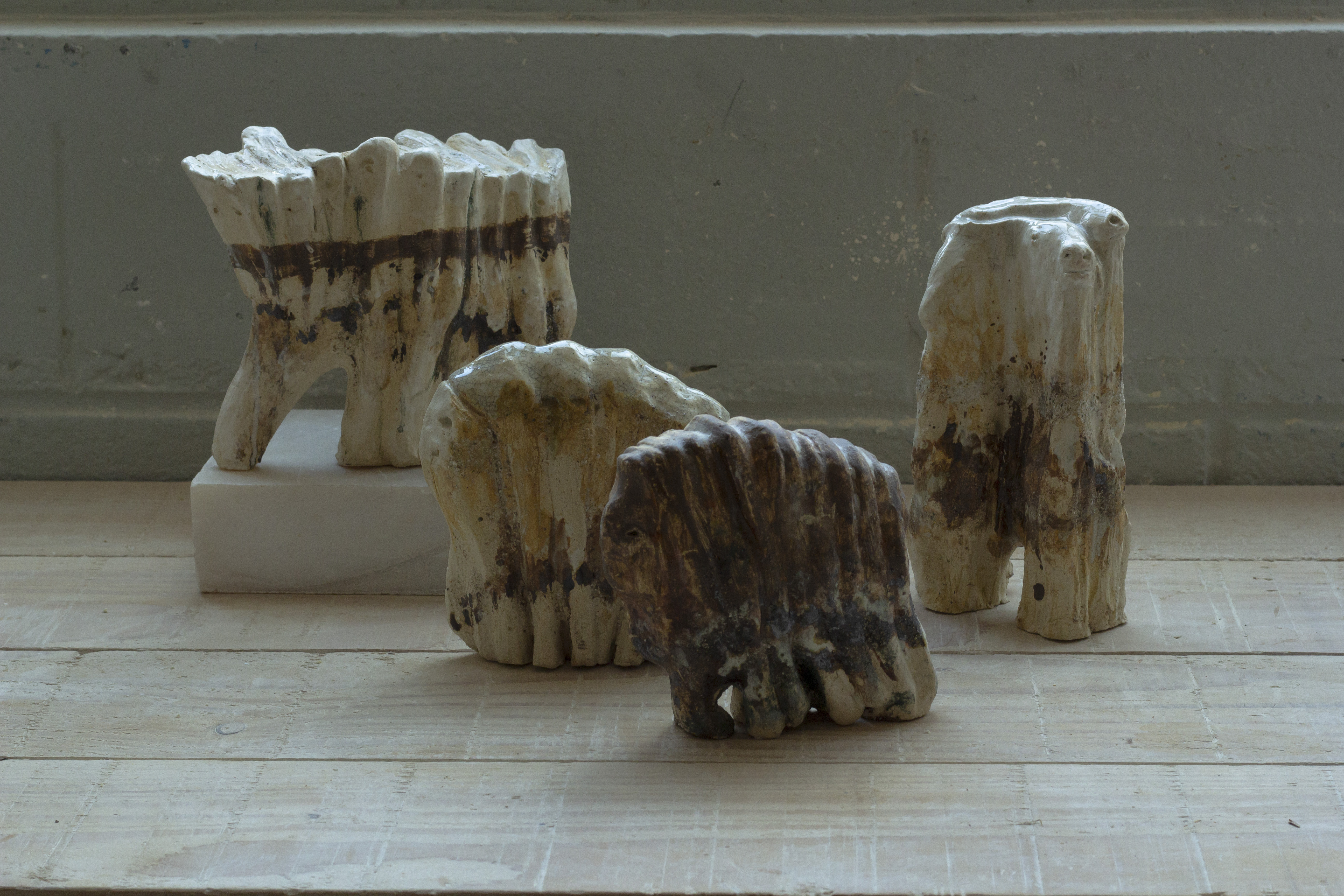 Cette série de céramique en grès, s’inspire de restes osseux , en émerge les troupeaux desquelles ils sont issus. Dents de bisons et mammouth, vertèbres de baleines. Une sorte de paléontologie fantastique ou toute une espèce serait contenue dans son plus petit vestige.