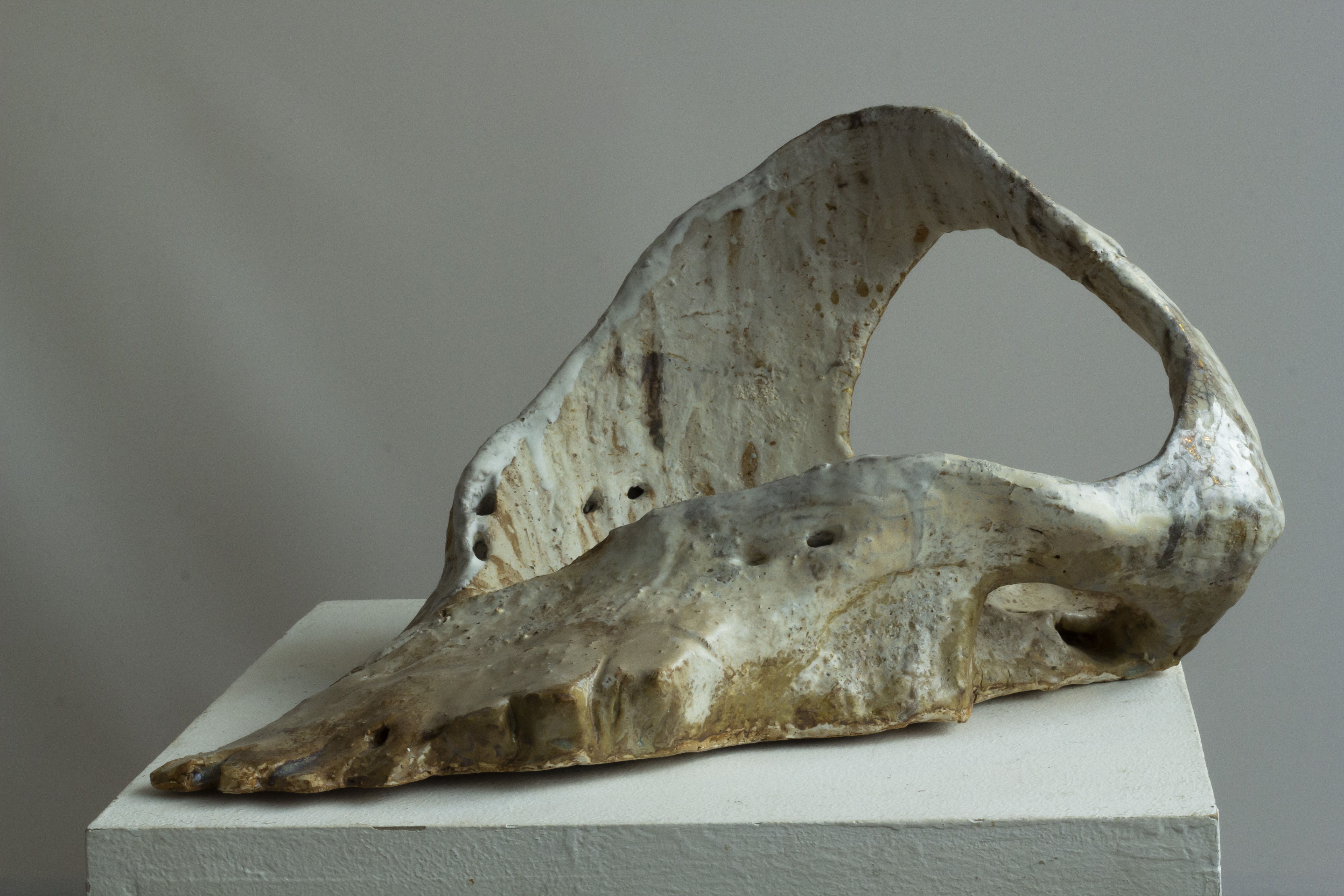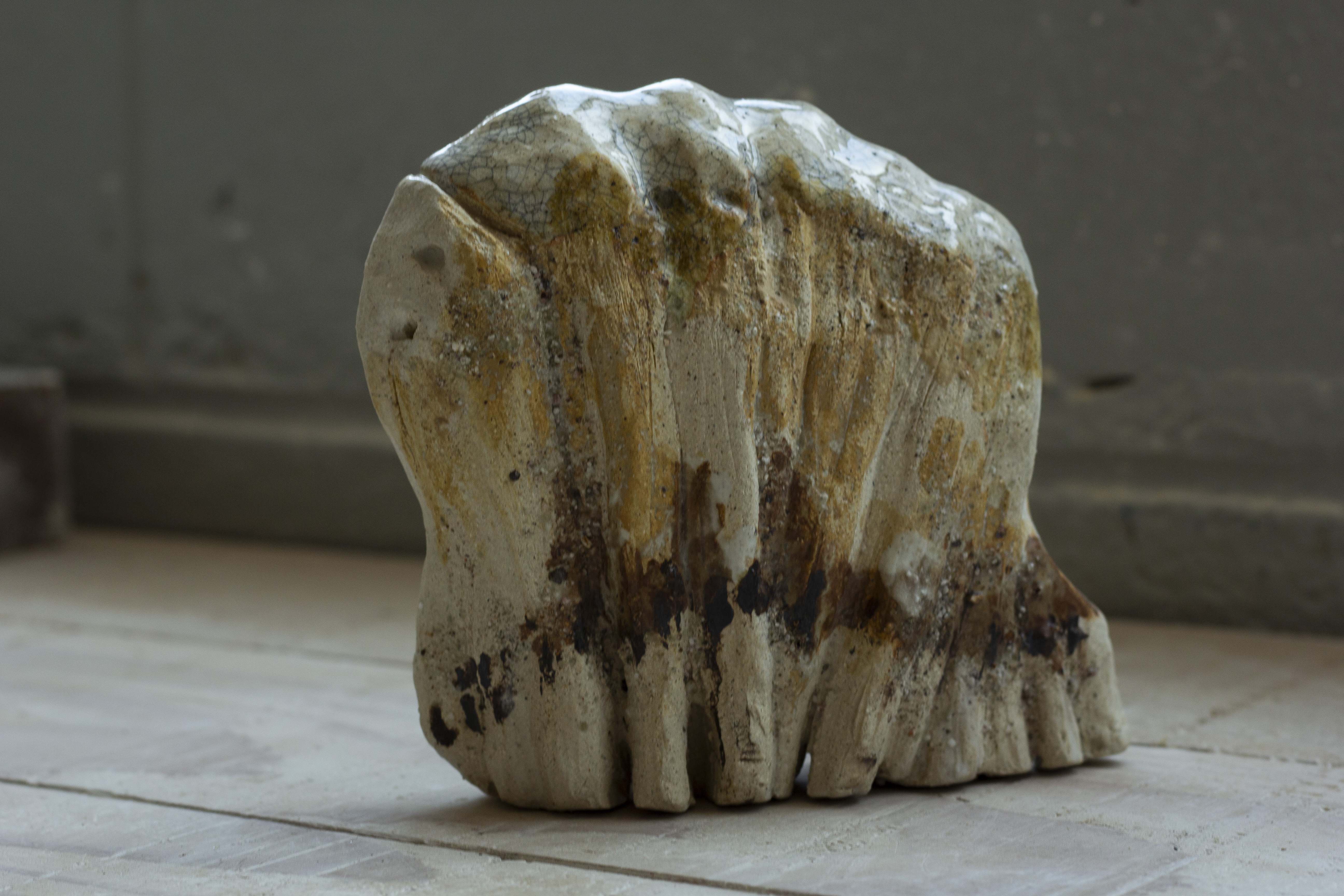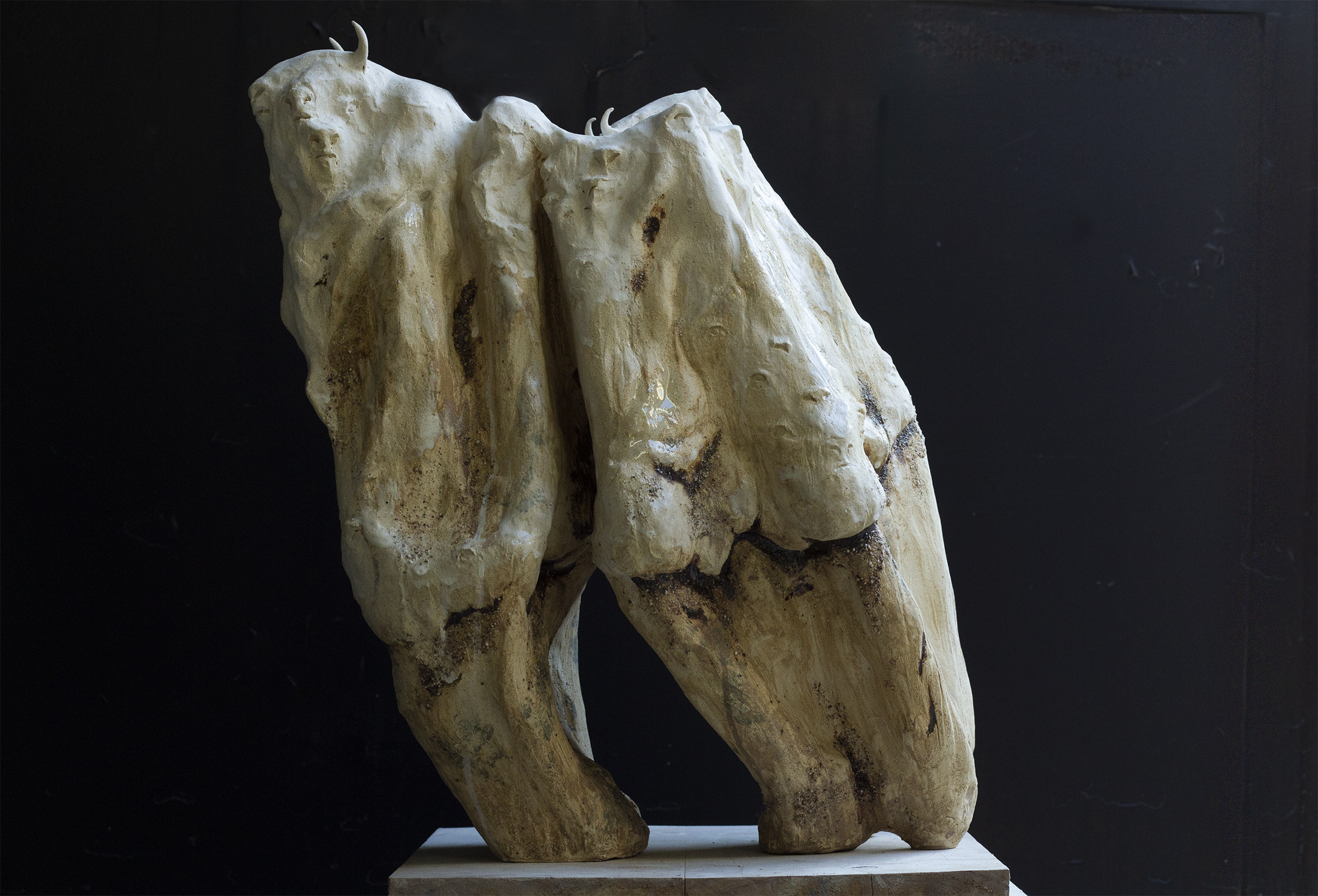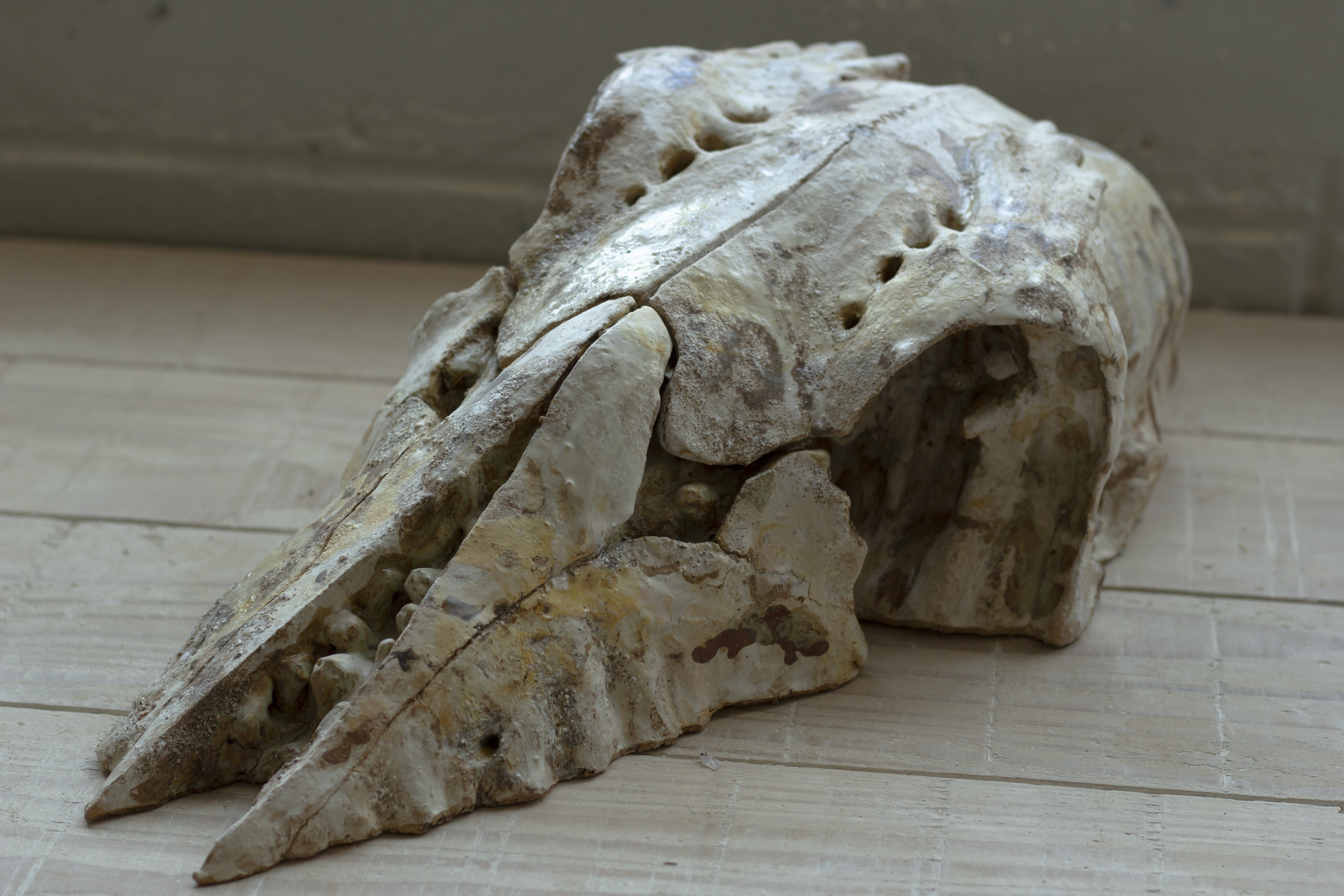 Cette série de céramique en grès, s’inspire de restes osseux , en émerge les troupeaux desquelles ils sont issus. Dents de bisons et mammouth, vertèbres de baleines. Une sorte de paléontologie fantastique ou toute une espèce serait contenue dans son plus petit vestige.